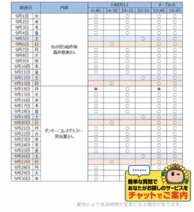 9月!! 2020.09.01 おしらせ ♡9/14〜放送♡ ひまわりテレビ 「長久手に暮らすアーティスト」 ダンススペース夏 苅谷夏 前の記事 テレビ取材✨ 2020.08.29 次の記事 クラス時間✨ 2020.09.11